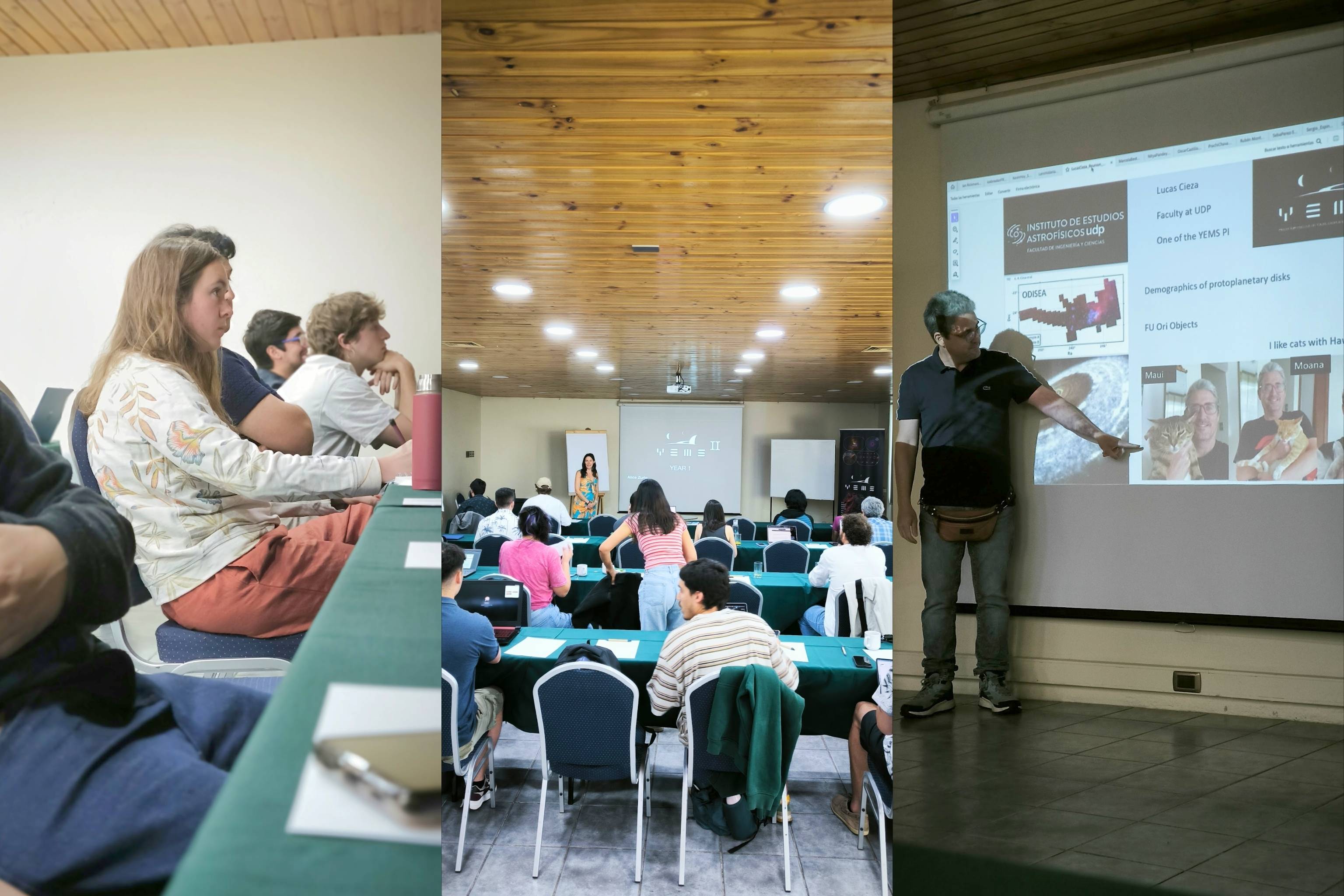 La jornada comenzó con la salida del bus desde Los Héroes rumbo a San Esteban y una sesión de presentaciones personales que permitió conocernos mejor como equipo, incluyendo a estudiantes, postdocs, estudiantes visitantes y académicos de las distintas instituciones que conforman YEMS. Luego, una serie de charlas cortas mostró el amplio espectro de temas que estamos abordando: desde la búsqueda de exolunas y el estudio de estrellas eruptivas, hasta la química de discos protoplanetarios, las poblaciones de cometas y la evolución de sistemas múltiples estelares.