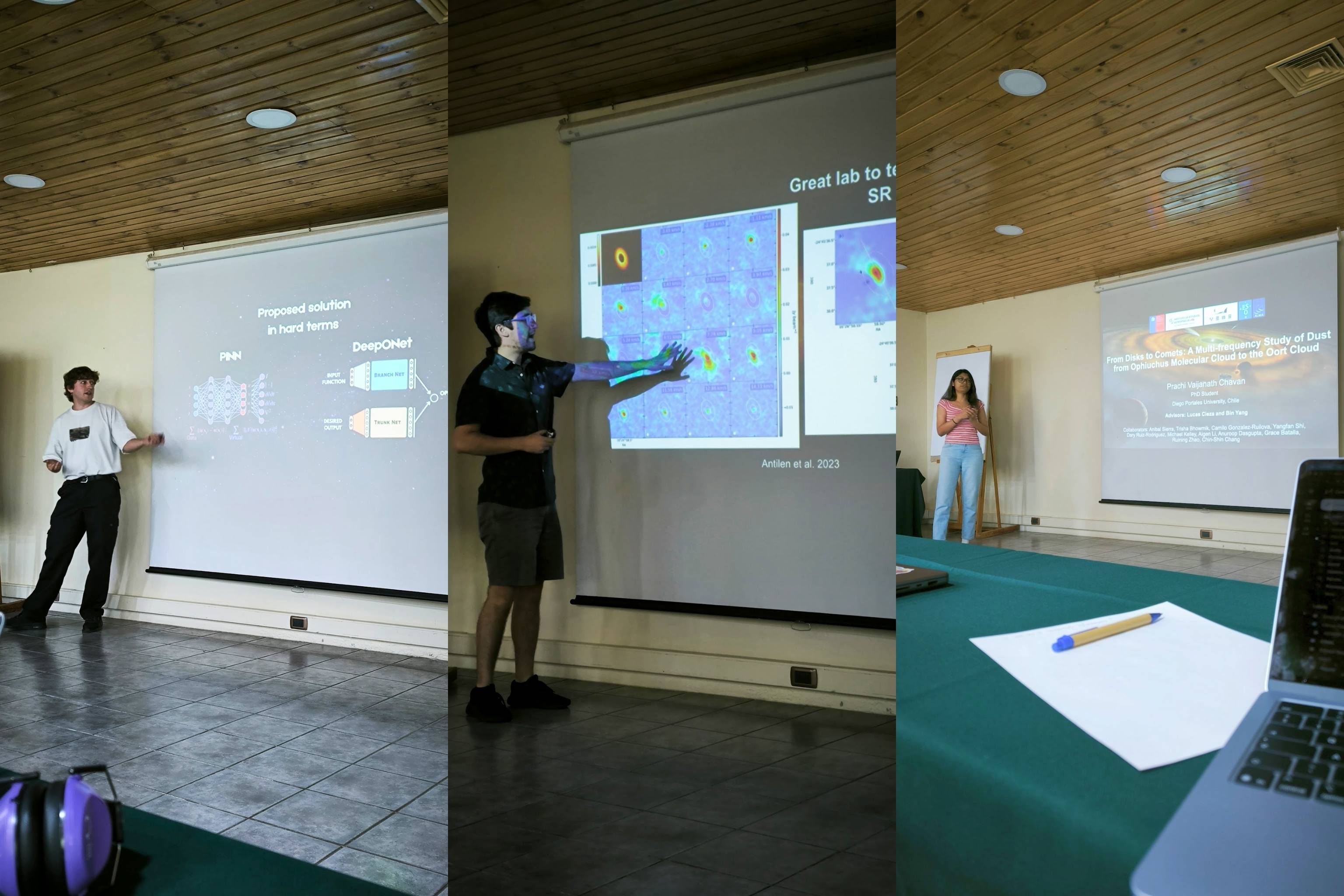 Un bloque importante estuvo dedicado a las herramientas de inteligencia artificial y ciencia de datos que estamos desarrollando en el Núcleo: redes neuronales para mapas de momentos, inferencia de parámetros hidrodinámicos con Deep Operator Networks, autoencoders para mejorar el contraste en imágenes de alto rango dinámico y nuevas implementaciones de algoritmos de procesamiento de datos. Estas contribuciones muestran cómo YEMS integra de forma natural la astrofísica, la informática y la instrumentación de vanguardia.